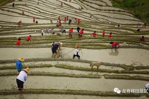 当天万人壮、瑶少数民族男女集结在九龙五虎观景平台下方层层叠叠的梯田上,一对对男女耦耕劳作的身影在镜面梯田的映衬下上演一幅惊天地、泣鬼神的优美劳动画卷......