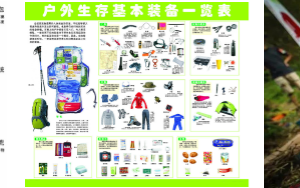 【户外基础】:户外装备认识(背包、露营装备、绳索锁扣、急救包、炊具等),户外安全(方向辨认,自救方法,草木动物,生存小技能)。