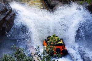大型室外实景特技表演。2000立方米的洪水倾泻而下,爆破、枪战、烟火、声光、滑水……势不可挡的音效和光影特效冲击,讲述奇幻神秘的山洪故事。